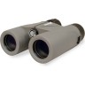 Бинокль можно подстроить под индивидуальные особенности владельца: межзрачковое расстояние меняется, на правом окуляре есть кольцо настройки диоптрий, поворотно-выдвижные наглазники позволяют подобрать оптимальное положение прибора относительно глаз. Эргономичный корпус покрыт светло-серой резиновой оболочкой – бинокль удобно ложится в руки и не выскальзывает.